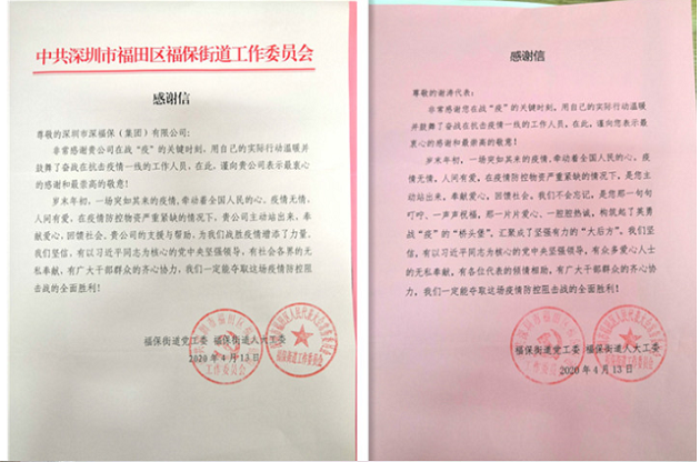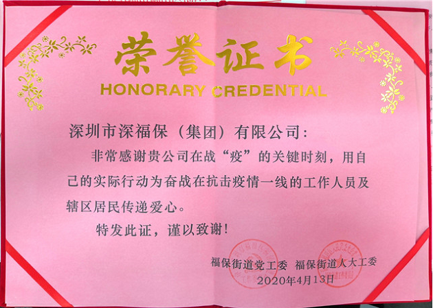 近日,福保街道党工委、福保街道人大工委向集团颁发了抗疫荣誉证书和感谢信,表彰和感谢乐鱼集团及福田区人大代表、集团党委书记董事长谢涛在抗疫期间对辖区一线抗疫工作的支持和配合。市公安局交通警察局向物业公司颁发了《同舟共济以爱筑城》荣誉证书,感谢物业公司在抗疫期间对交警工作的关心与支持。